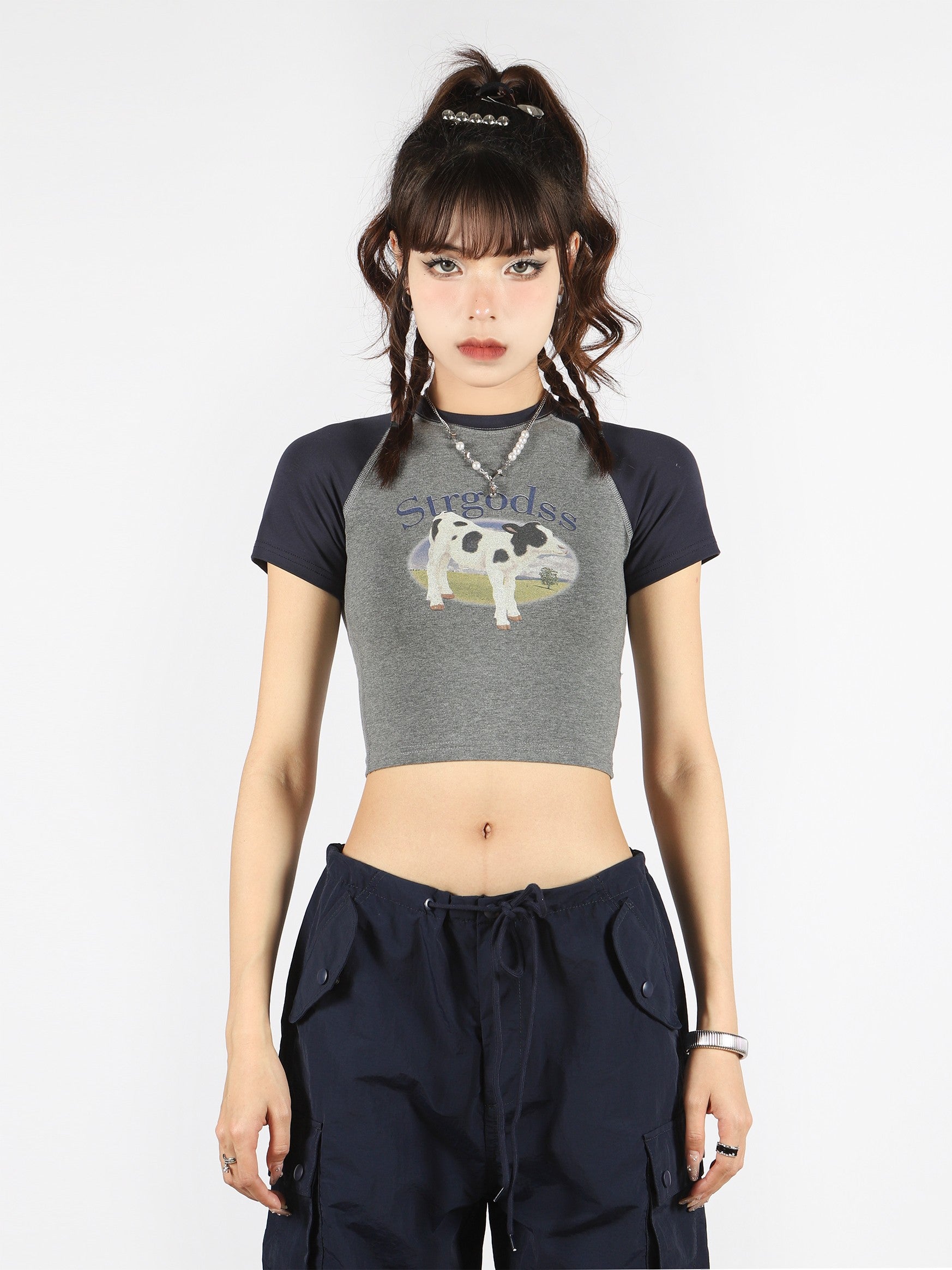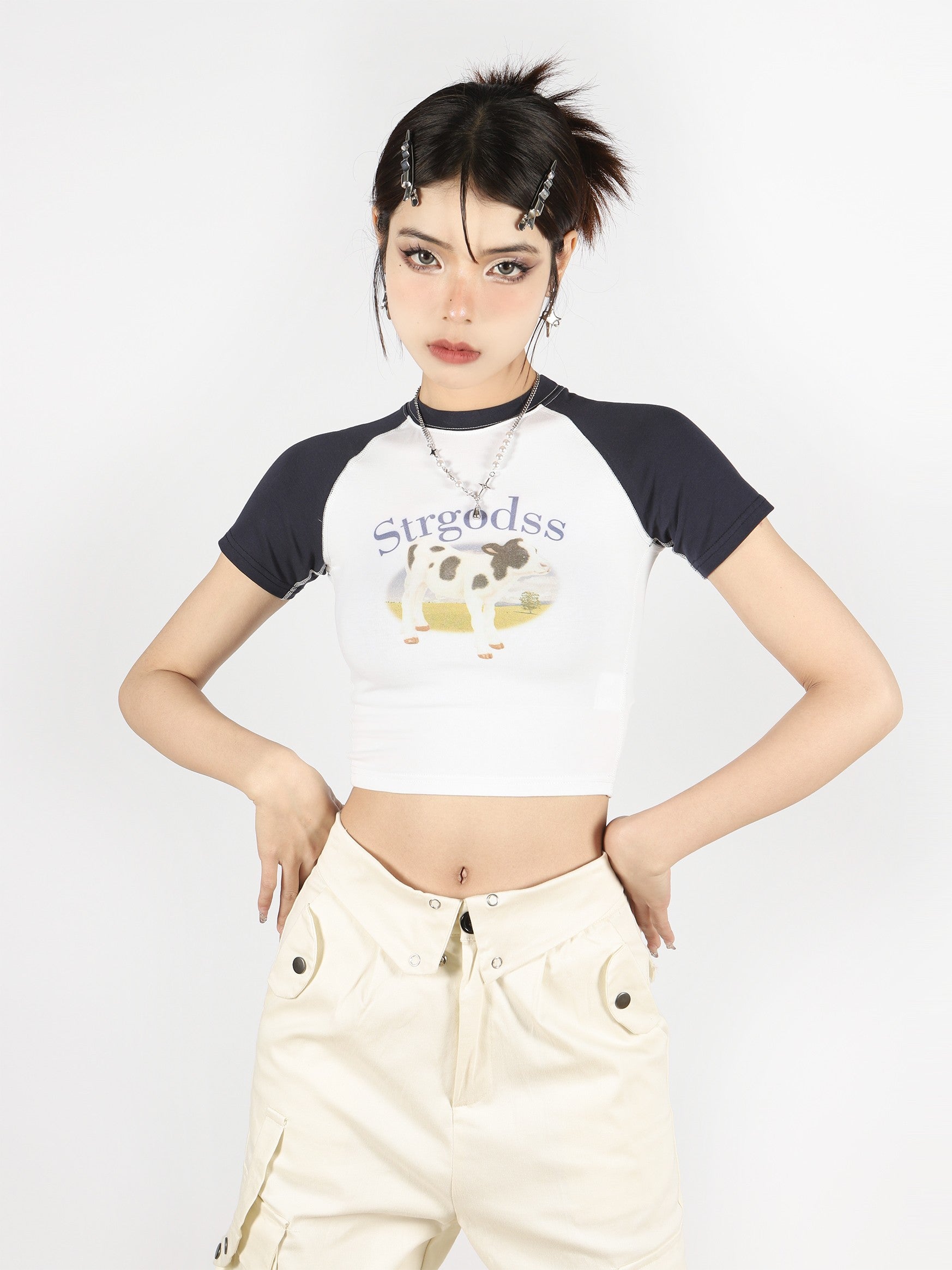 Our Cow Print Raglan Baby Tee is a stylish and comfortable way to show off your wild side. Featuring a raglan crop top for a unique twist on classic style, this top is perfect for all occasions.
