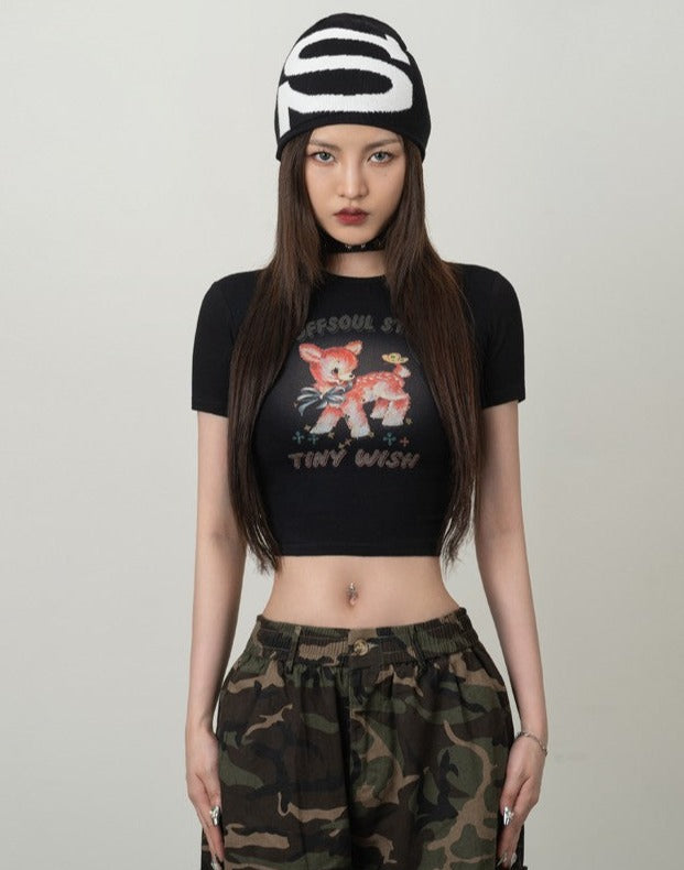 This cute Fawn Graphic Baby Tee is perfect for looking stylish and staying comfortable. This crop top features a cute fawn graphic that will add a special touch to any outfit.