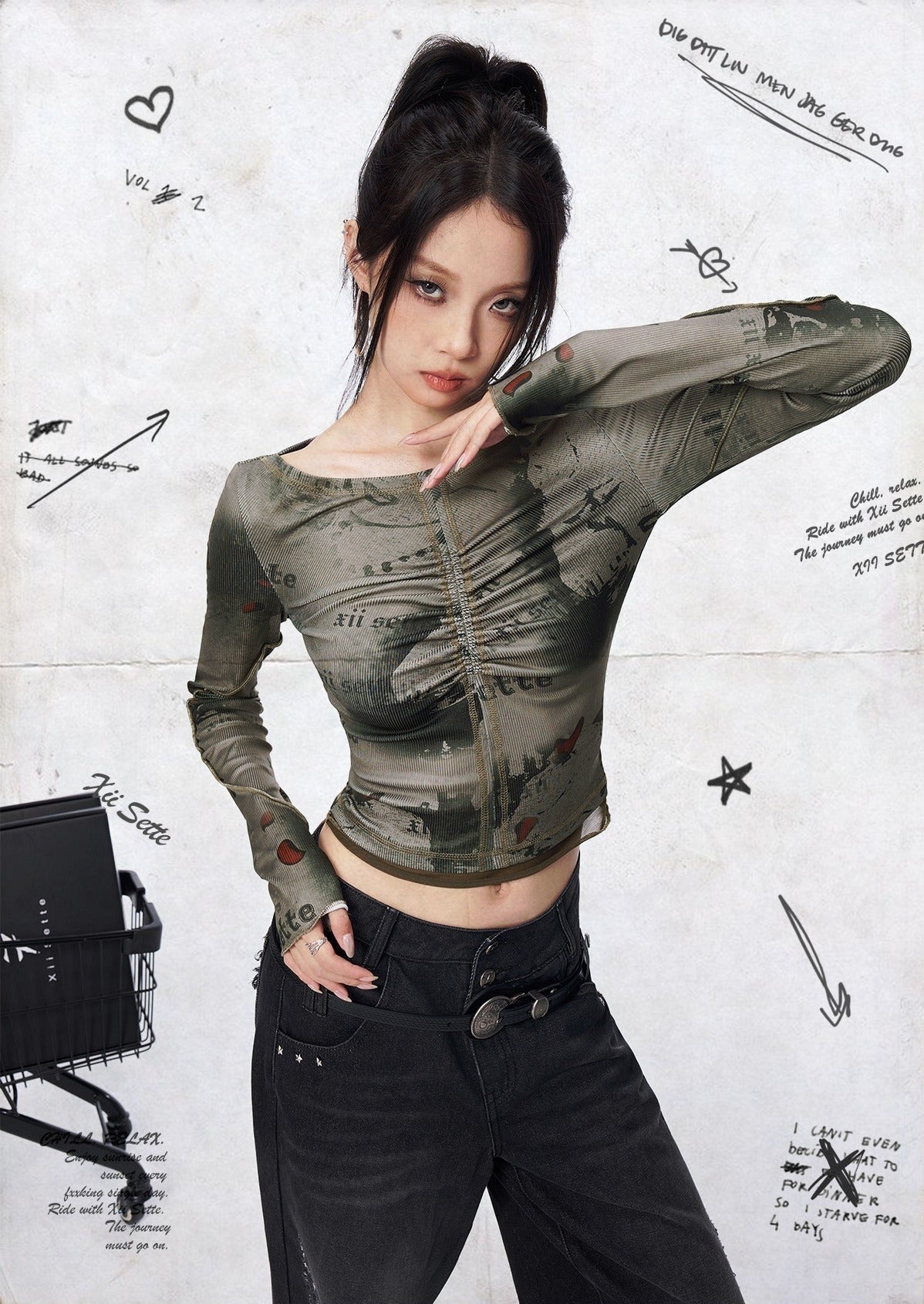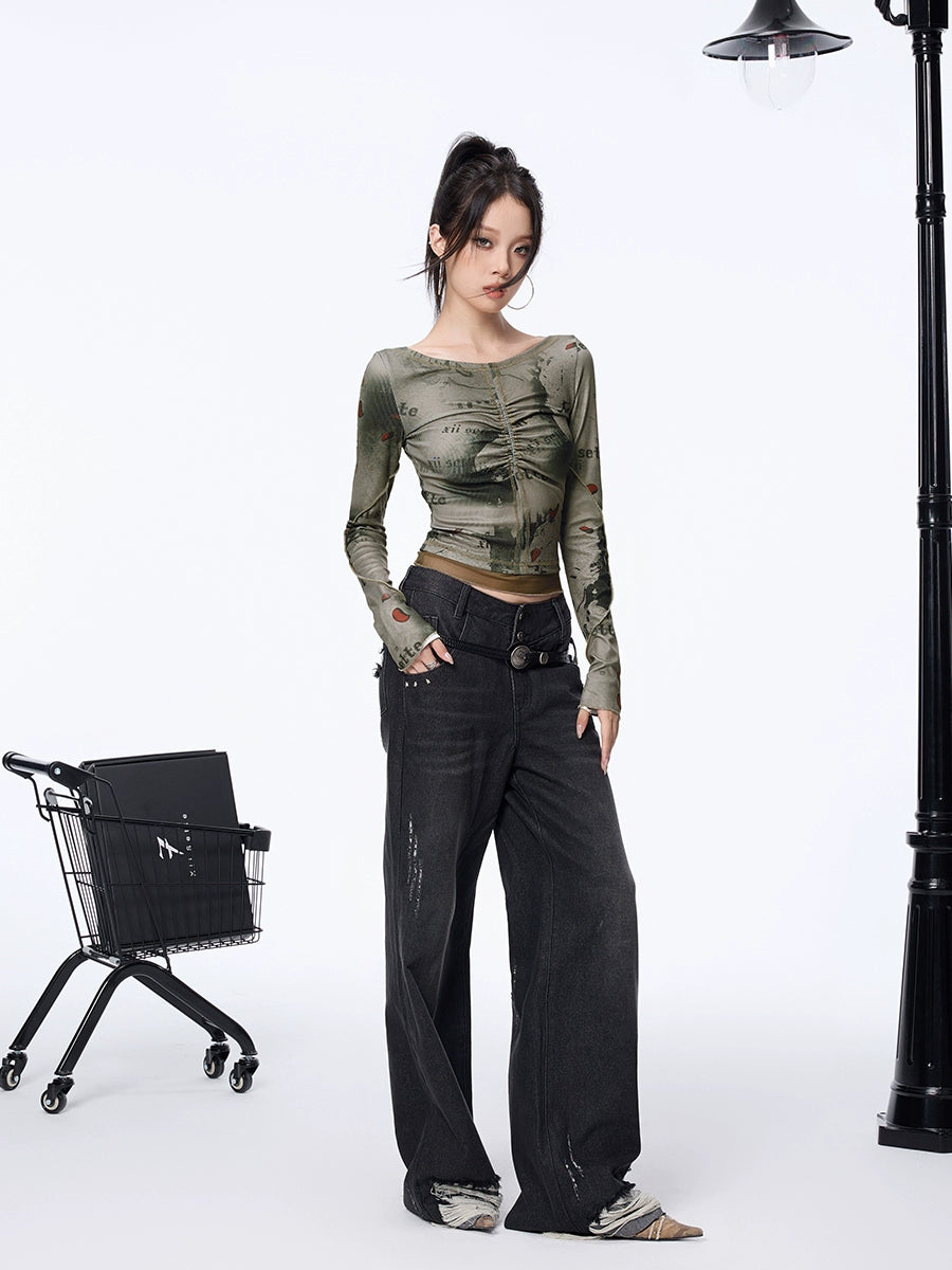 Channeling a grunge aesthetic, this fitted top boasts a boat neckline and long sleeves. Vintage-inspired typography graphics blend seamlessly with the front's ruching detail. The ribbed knit texture, crafted from a poly spandex blend.