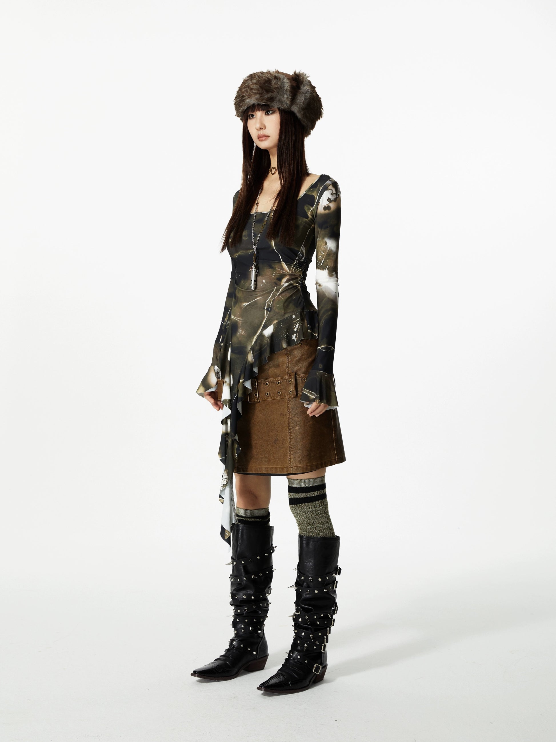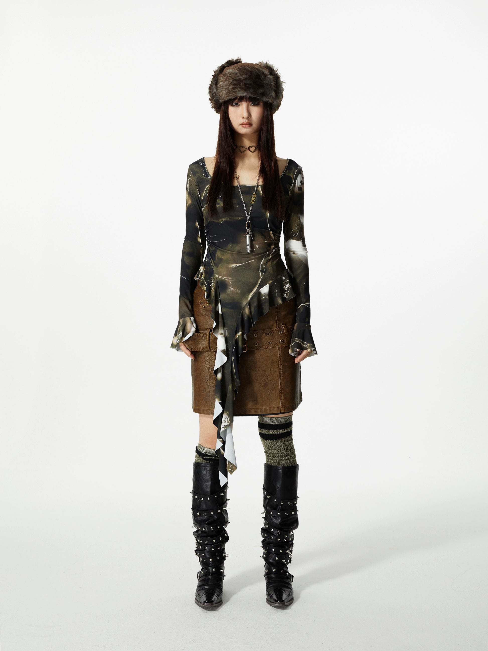 Embrace the fusion of edgy design and comfort with this asymmetrical top, featuring an enigmatic abstract pattern. Crafted with a durable poly blend, this long-sleeved piece boasts an unconventional trailing accent, perfect for making a statement.