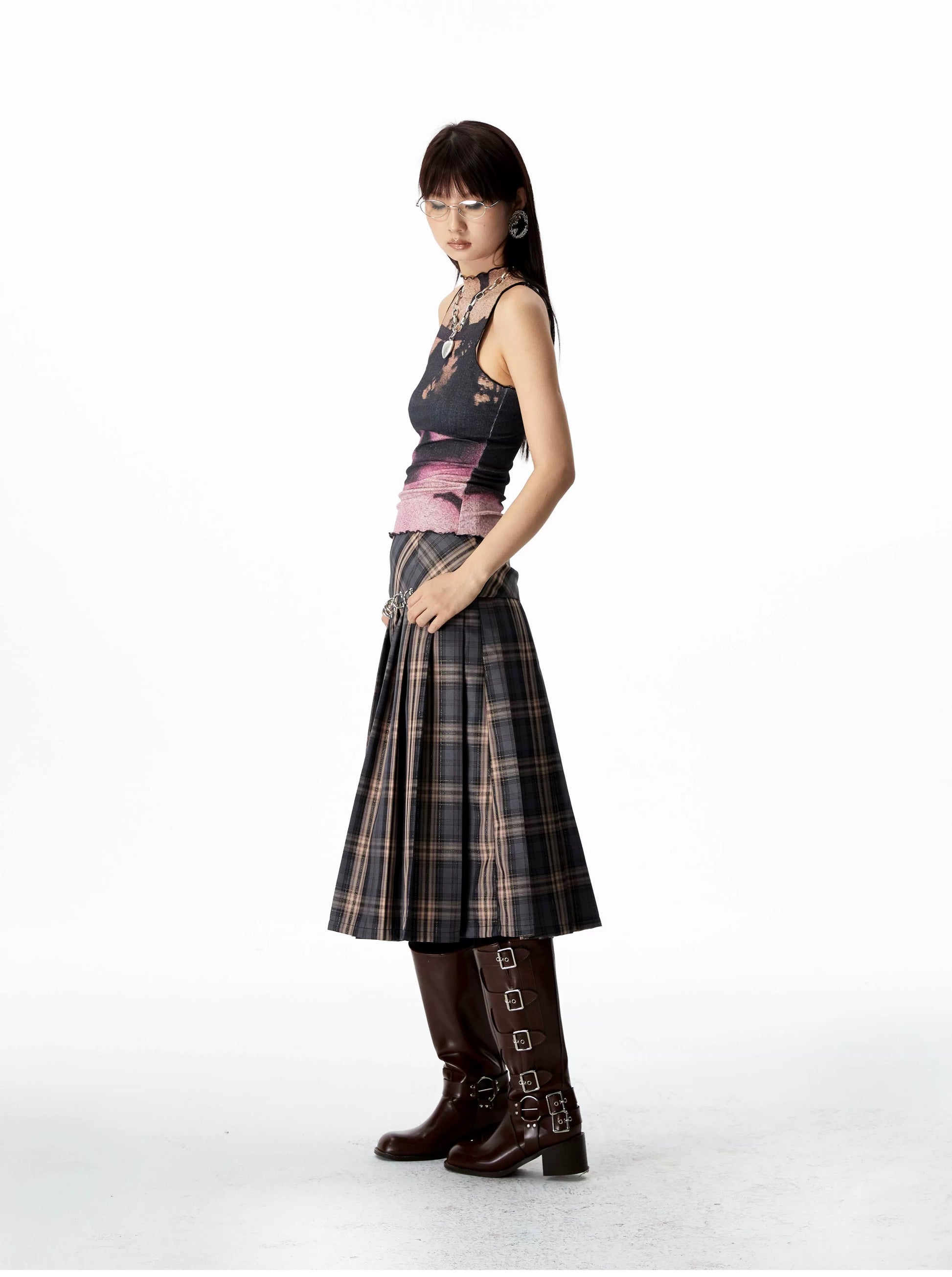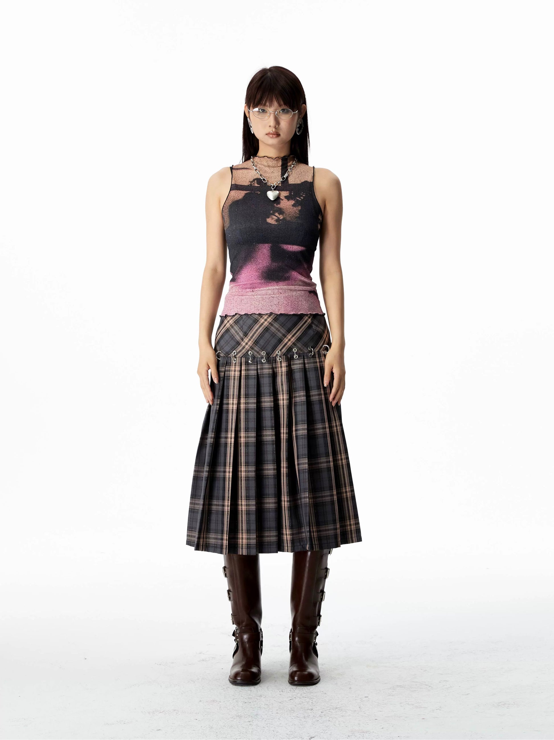 Elevate your style with our sleeveless tank top, showcasing a chic pink gradient and shadow motifs. Designed with a sophisticated high neckline and a delicate scalloped hem, it’s finely crafted from a premium poly-spandex blend for ultimate comfort.