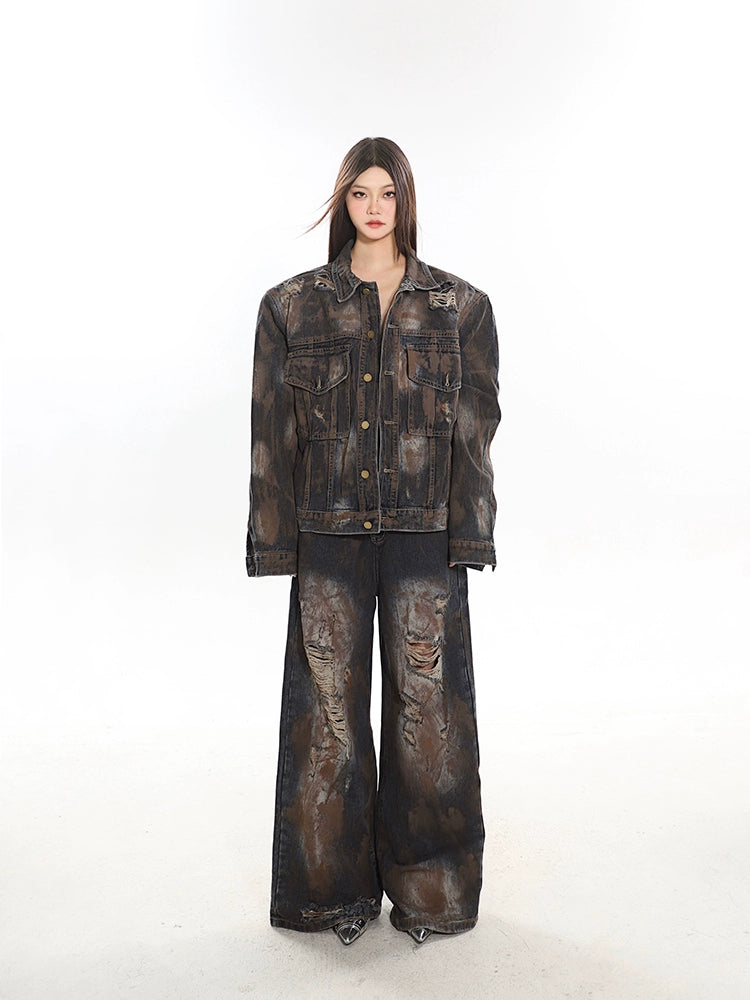 These vintage destroyed grunge jeans feature a relaxed bootcut flare and a rust paint distressed wash. The ripped and shredded detail adds a touch of edginess to your look.